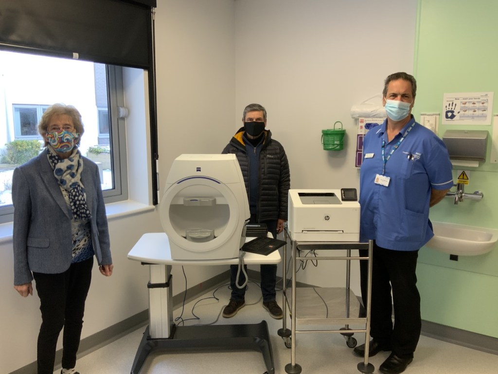 Cllr Angela Newton with Renzo Gheradi, Chairmen of Pennygate Patient Link, presenting new eye equipment worth £33,000 to Johnson Hospital